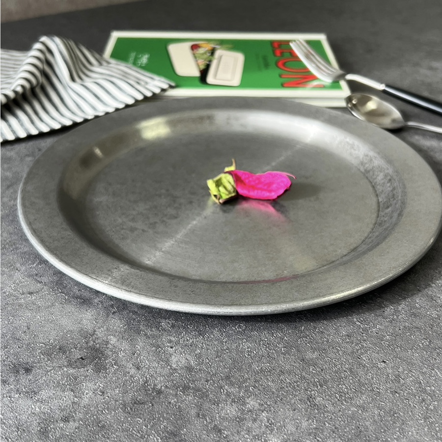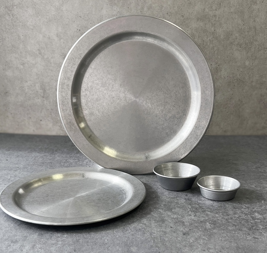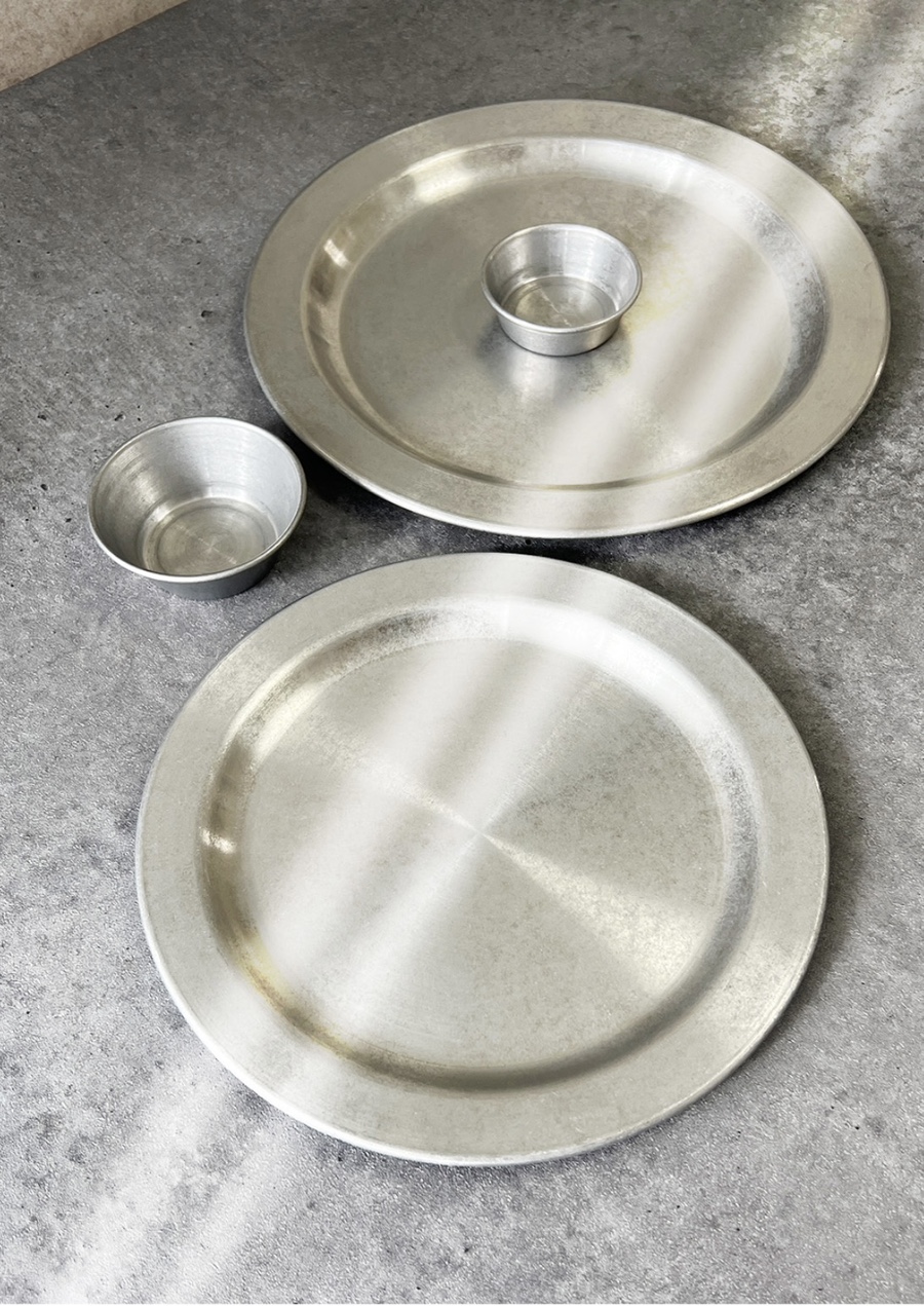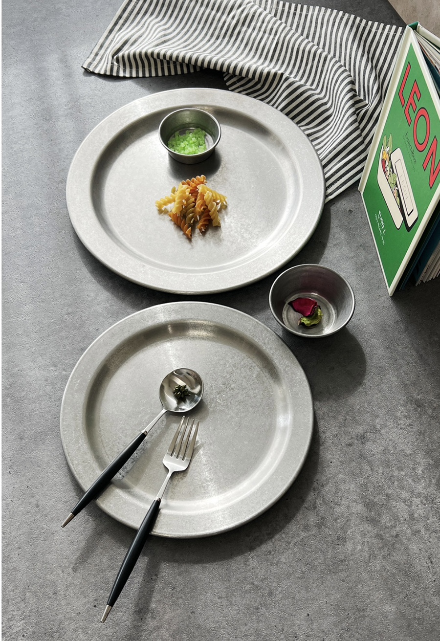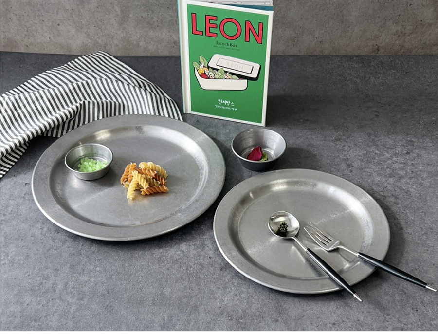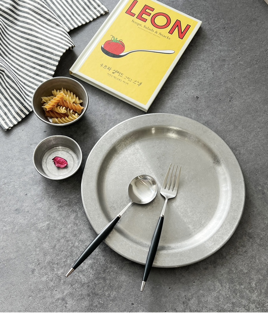 빈티지 무드의 원형 스텐접시입니다.