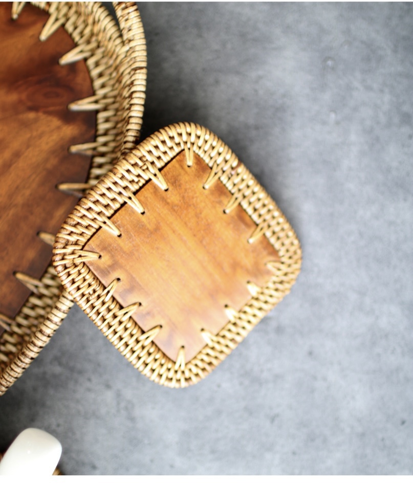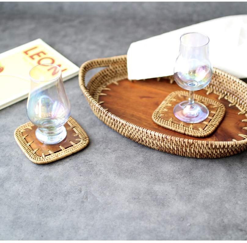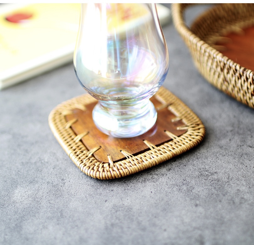 빈티지 마호가니 우드 라탄 사각 컵받침